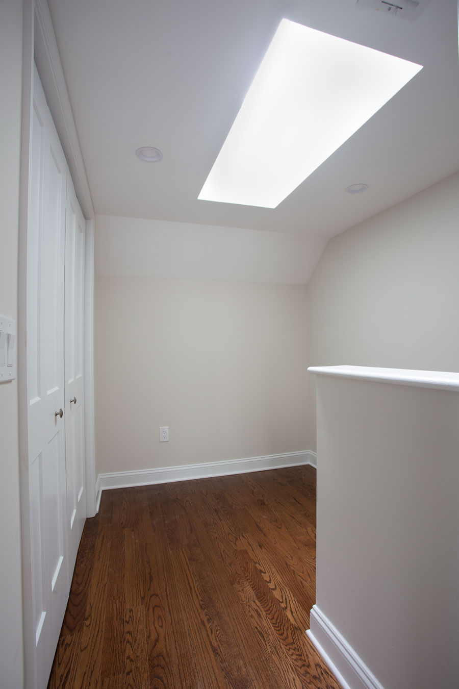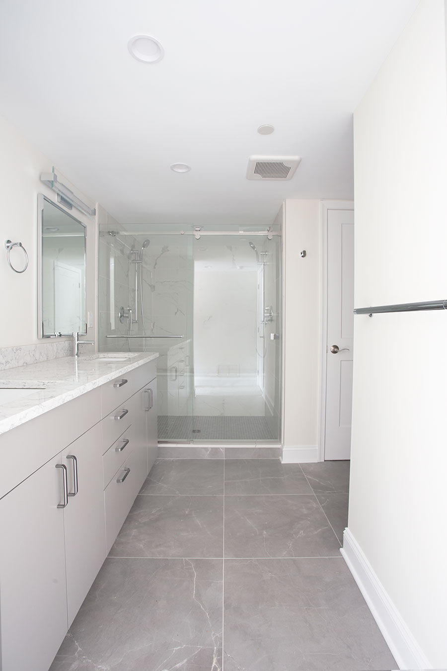The newly refinished space now has a clean and contemporary aesthetic. The once yellowed oak floors are now a warm, rich brown, contrasting beautifully with the bright and airy kitchen. The primary bathroom which once dawned glass block walls and and oversized jetted tub, now has a sleek shower and modern finishes.